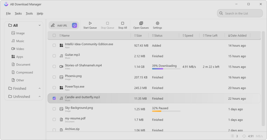 AB Download Manager, indirme süreçlerini hızlandıran, tarayıcı entegrasyonu sunan ve açık kaynaklı bir indirme yöneticisidir. Çoklu iş parçacıklı (multi-threaded) indirme ile HTTP dosyalarını çok daha hızlı indirir; kesilen indirmeleri kaldığı yerden devam ettirebilir. Tarayıcı eklentisiyle tüm indirmeler otomatik olarak AB Download Manager’a yönlendirilir. Zamanlama, hız sınırlama ve kategori bazlı indirme yönetimi özellikleri içerir. Windows’ta ücretsiz çalışır.