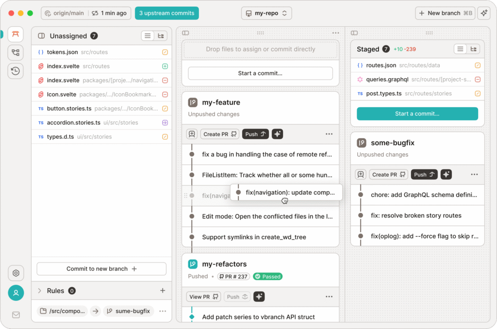 GitButler, geleneksel Git iş akışını yeniden tasarlayan, Rust ve Tauri ile geliştirilmiş modern bir versiyon kontrol istemcisidir. Sanal dal (virtual branch) sistemi sayesinde aynı anda birden fazla değişiklik kümesi üzerinde çalışabilir, bunları bağımsız olarak commit edip push yapabilirsiniz. Karmaşık git rebase, stash ve cherry-pick işlemlerini görsel ve sezgisel arayüzle basitleştirir. GitHub entegrasyonu sayesinde pull request iş akışı uygulama içinden yönetilebilir. Windows, macOS ve Linux’ta ücretsiz kullanılabilir.